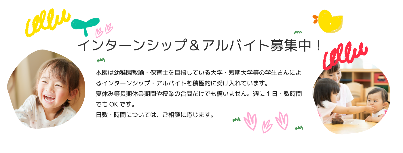 | ●法隆寺幼稚園 7:30~18:00までの間で6~9時間勤務 ◎実働8時間で1年間の変形労働制 休み:土日祝日(行事日勤務あり)、夏季休暇5日、年末年始休暇(12/29~1/3)、 有給休暇、年間休日125日(2021年度実績) ●小規模保育所(募集が終えている場合があります) 7:30~18:30の間で実働8時間シフト制 ※残業なし! 休み:日曜、祝日、週休二日制 |